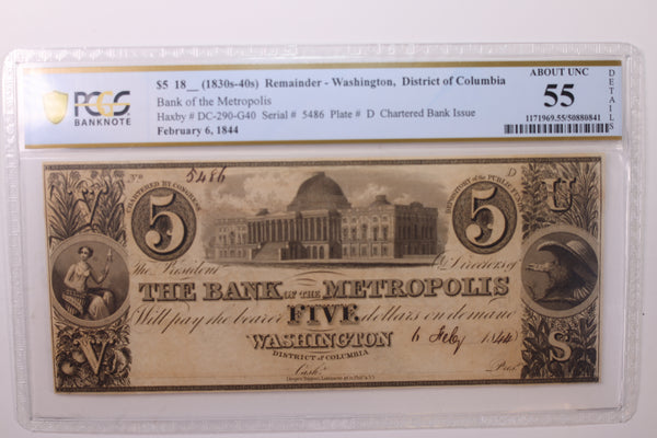 18__ $5., Washington D.C., Obsolete Currency., Remainder., PCGS AU55., Store #GDC008