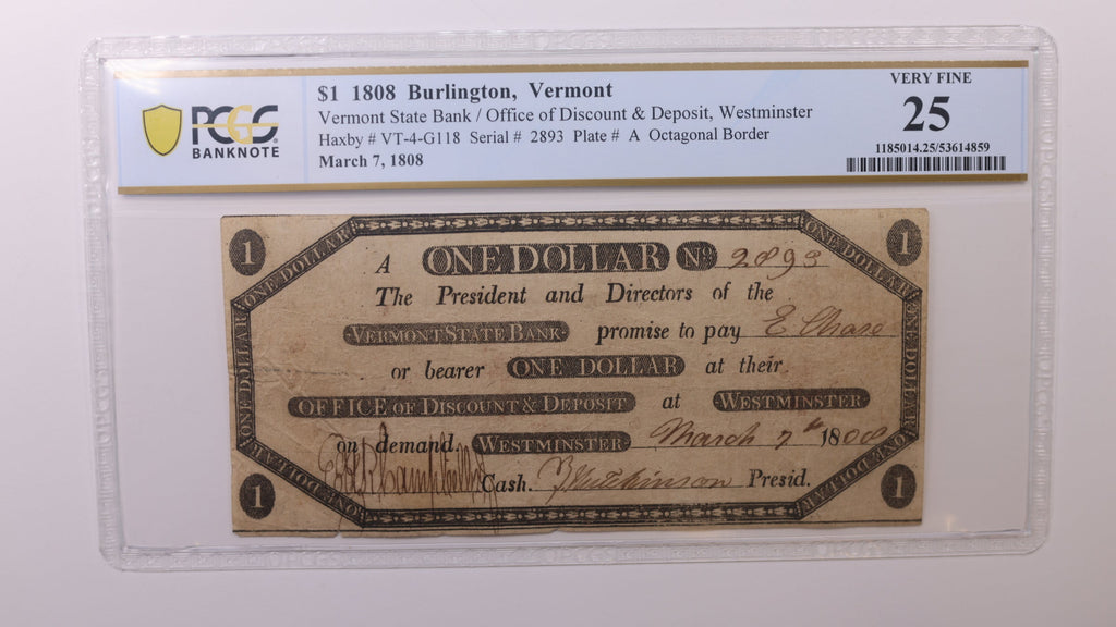 1808 $1, Burlington, Vermont, Obsolete Currency, PCGS VF25, Store #GVT006.