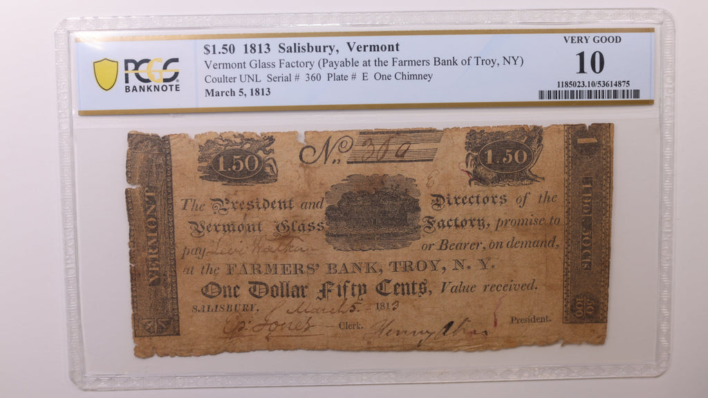 1813 $1, Vermont Glass Factory, Obsolete Currency, PCGS VG10, Store #GVT012.