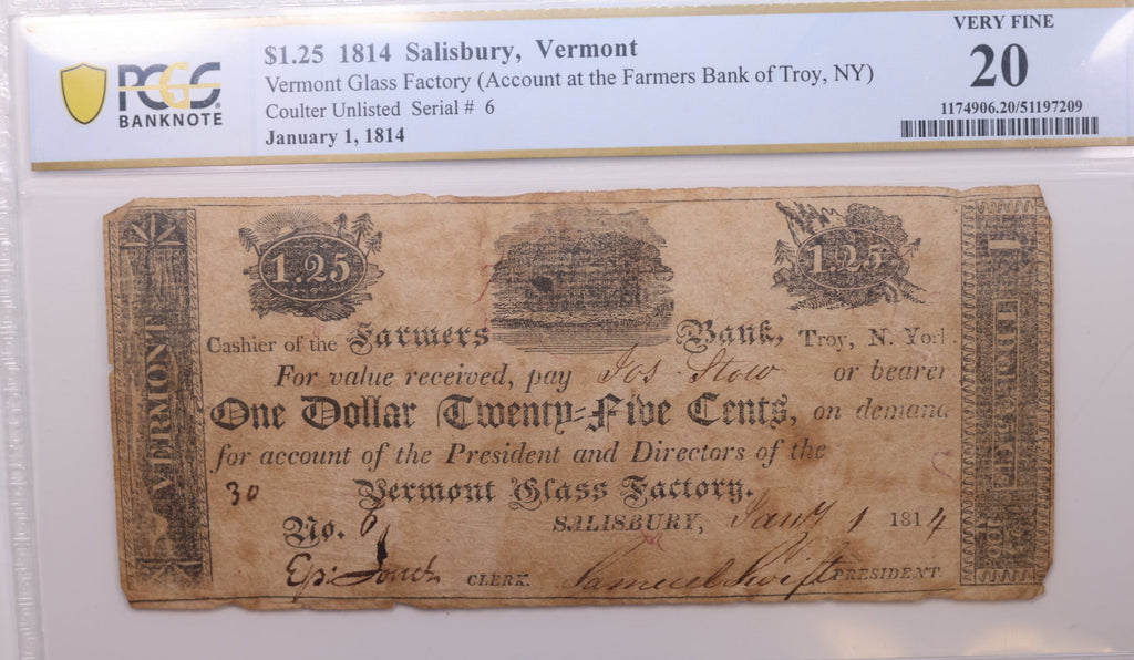 1814 $1.25, Salisbury, Vermont., Obsolete., PCGS VF-20., Store #GOVE001.