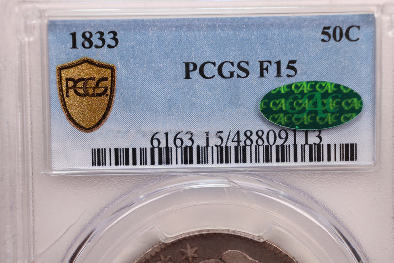 1833 Cap Bust Half Dollar., PCGS F-15., Green CAC Sticker., Store #GHR011