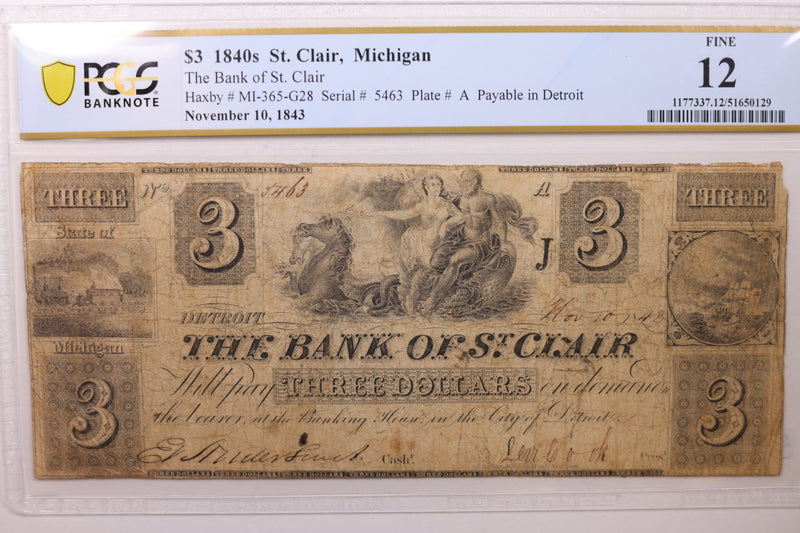 1843 $3, St. Clair, Michigan, Obsolete Note, PCGS Fine-12., Store #GMI0102.