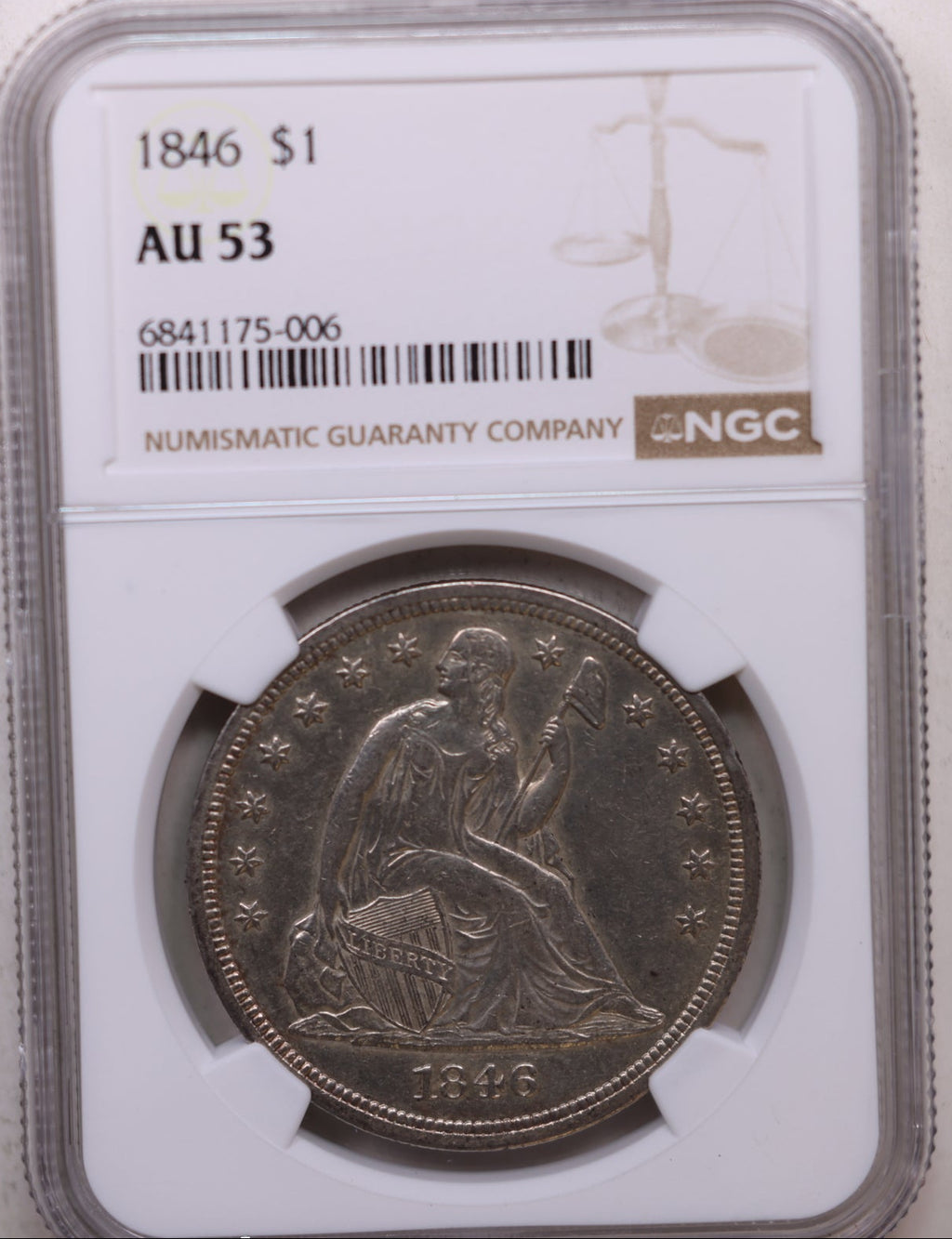 1846 Seated Liberty Silver Dollar, Circulated, NGC AU-53, Store #GDR0294.