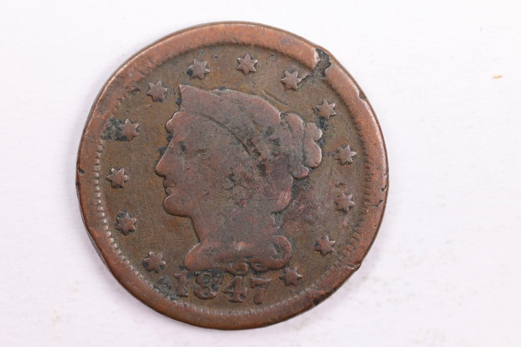 1847 Braided Hair Large Cent, Very Good Circulated Coin, Store #CT0043