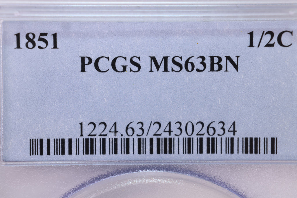 1851 HALF CENT., PCGS MS-63, BROWN., STORE SALE #GHC001