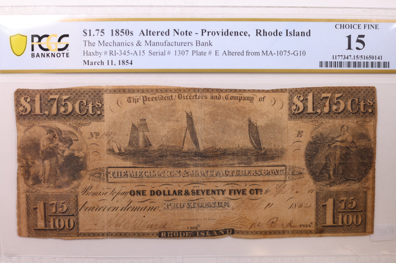 1852 $1.75, Providence, Rhode Island, Obsolete Currency, PCGS F-15, Store #GRI008