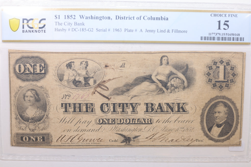 1852 $1, The City Bank, Washington D.C., Obsolete Note, PCGS F-15, STORE #GDC032.