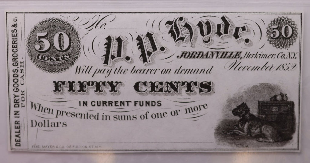1852 50 Cent., P.P. HYDE., Jordanville, N.Y., PCGS CU-65, PPQ., Store Sale #GNY001