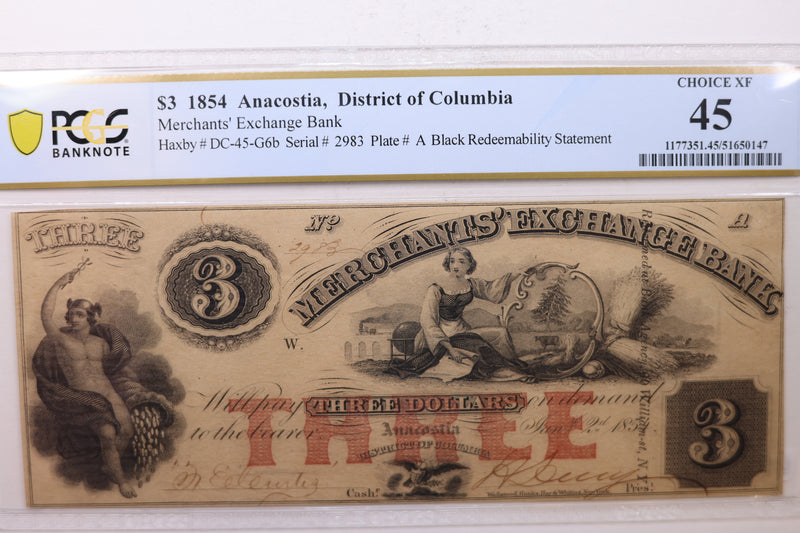 1854 $3, Anacostia, D.C., Obsolete Currency, PCGS XF-45., STORE #GDC015.