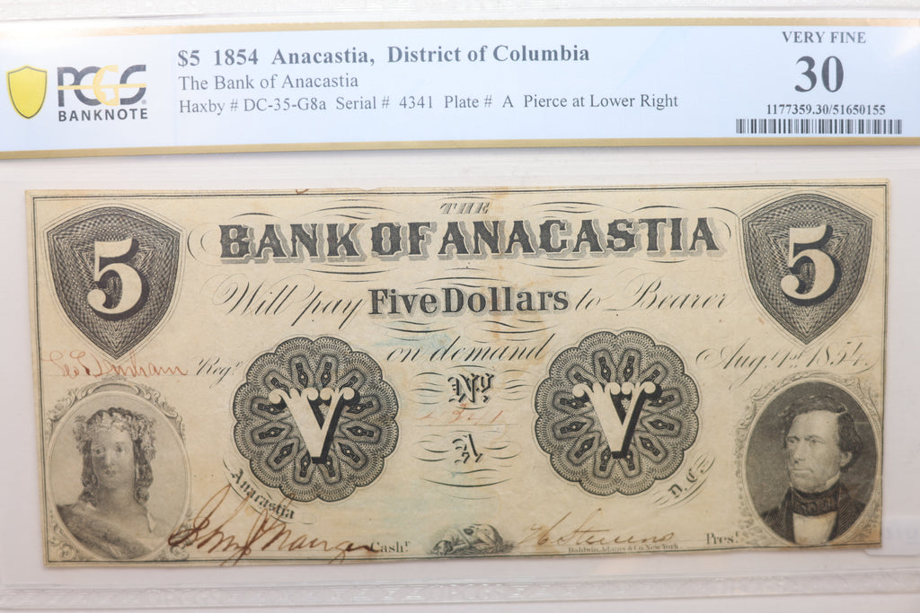 1854 $5 Bank of ANACASTIA, Washington, D.C. Obsolete, PCGS VF-30., STORE #GDC020.