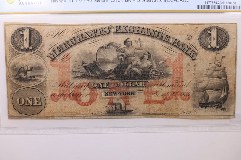 1856 $1, New York, New York, Obsolete Note. PCGS VF-20. Store #GNY015.