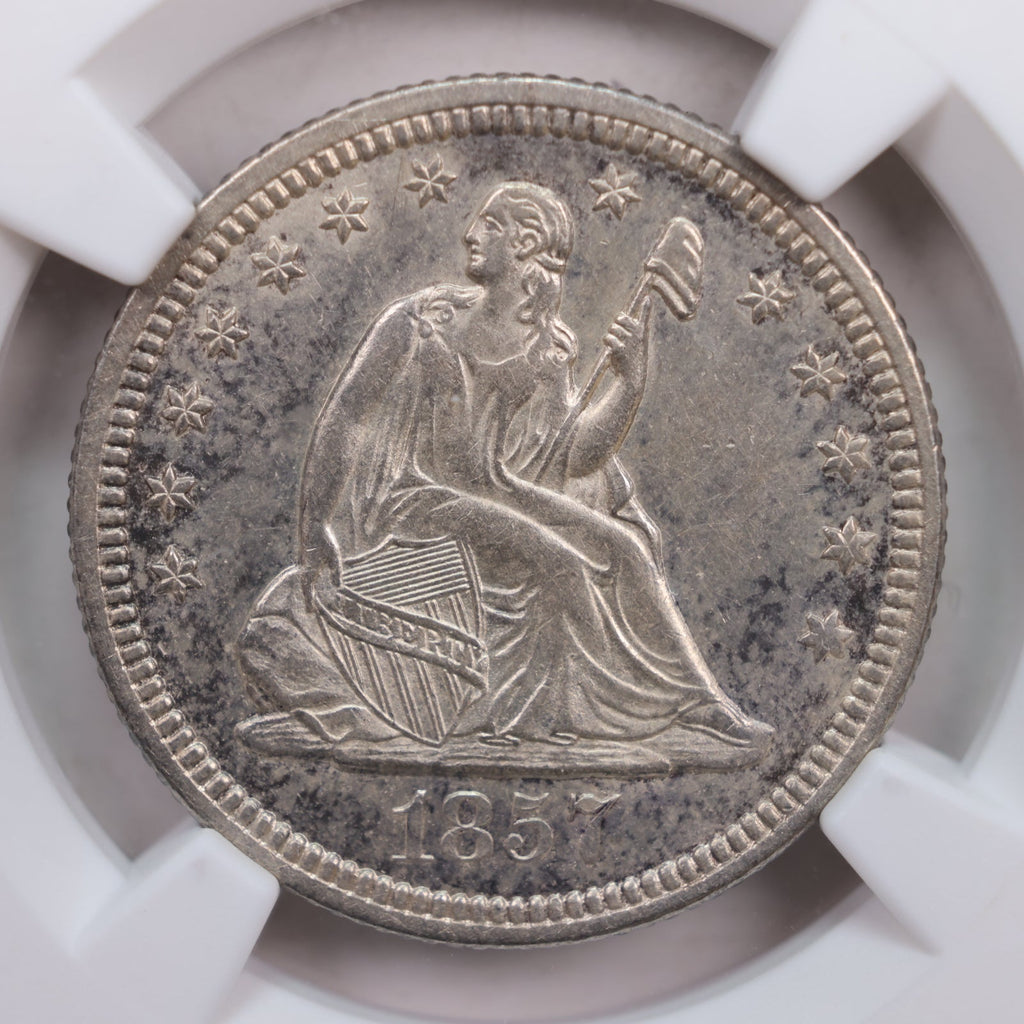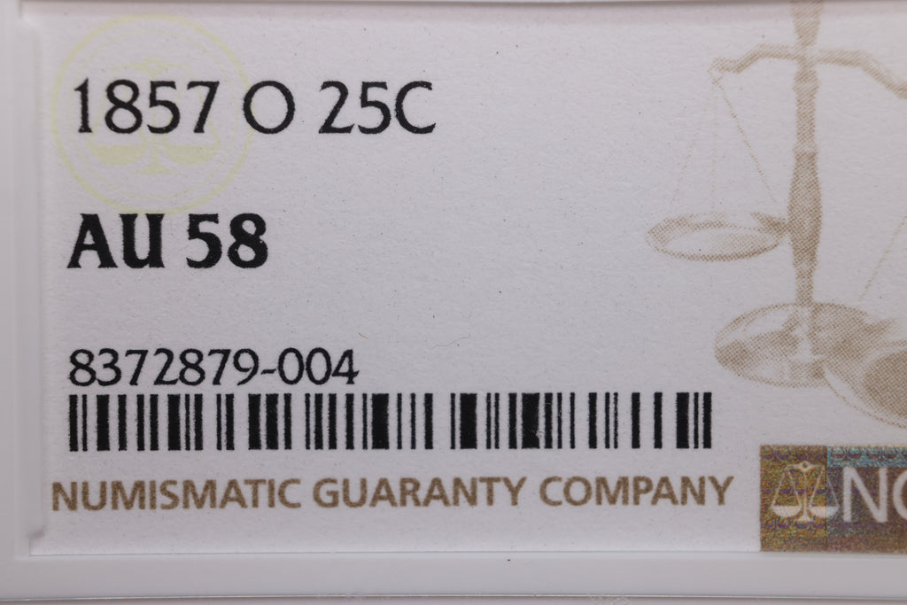 1857-O Seated Liberty Quarter., 'Scarce'., NGC AU-58 Coin., Store #GQR016