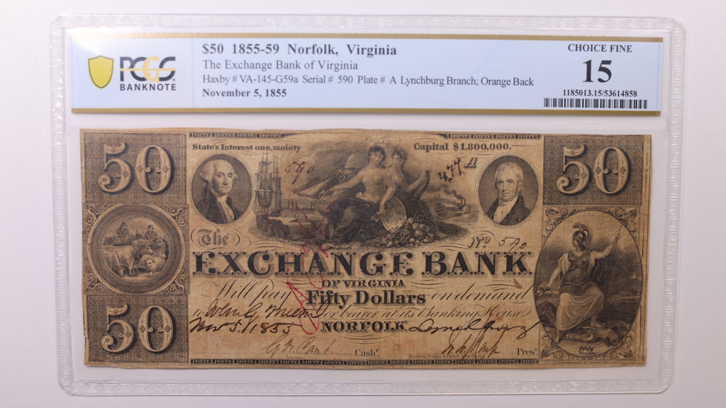 1858 $50, Norfolk Virginia, Obsolete Currency, PCGS Fine-15, Store #GVA027.
