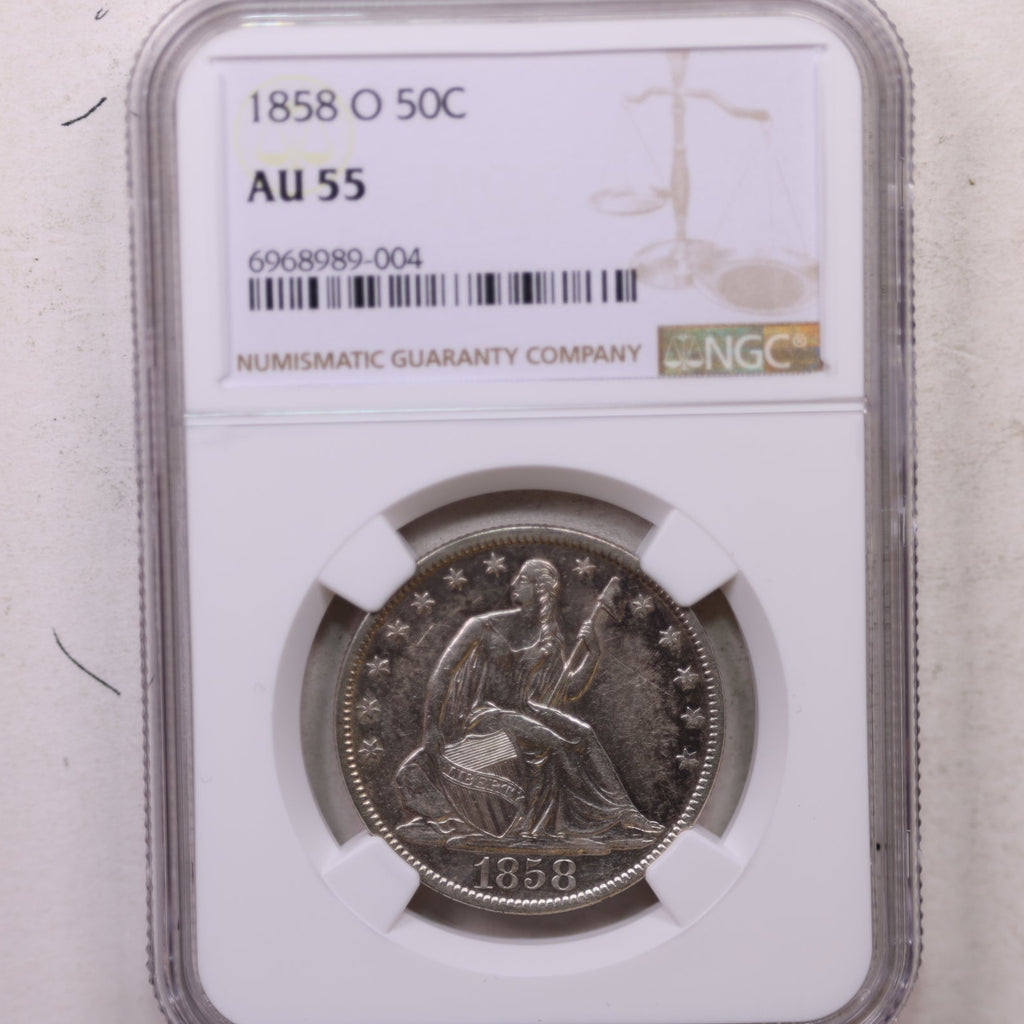 1858-O Seated Liberty Half Dollar, Nice Eye Appeal Coin, NGC AU-55. Store #GHR112.