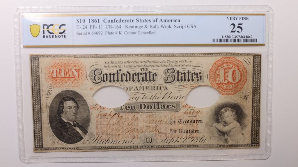 1861 $10, Confederate States, T24, Obsolete Currency, PCGS VF25, Store #GCSA006.
