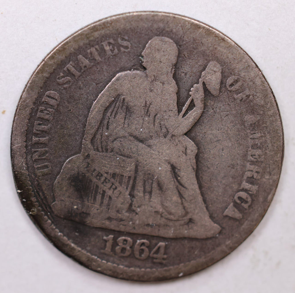 1864 Seated Liberty Dime, Collectible Circulated Coin, Store Sale #DE725.
