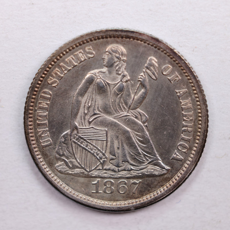 1867 Seated Liberty Dime., Mint State, Uncirculated Coin., Store Sale #DE0368.