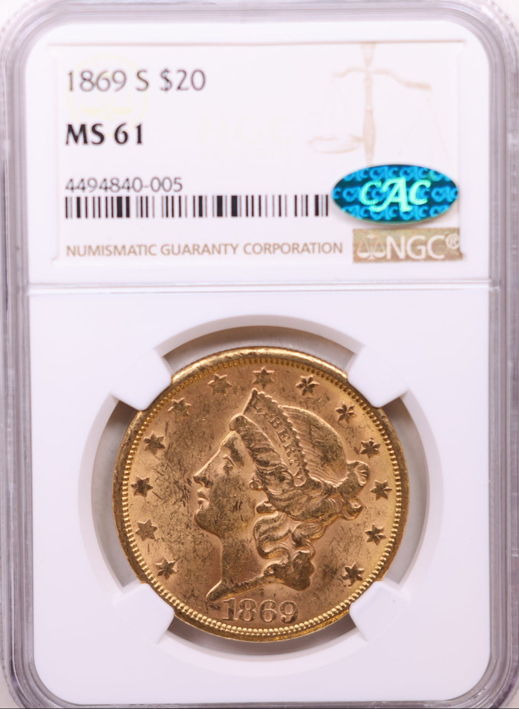 1869-S $20, Gold Double Eagle, Uncirculated, NGC MS-61, CAC, Store Sale #G0162.