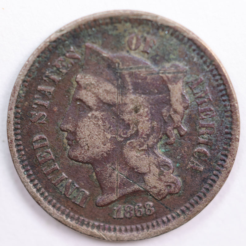 1868 Three Cent Copper Nickel, Abt Good Circulated Coin, Store #3C0009