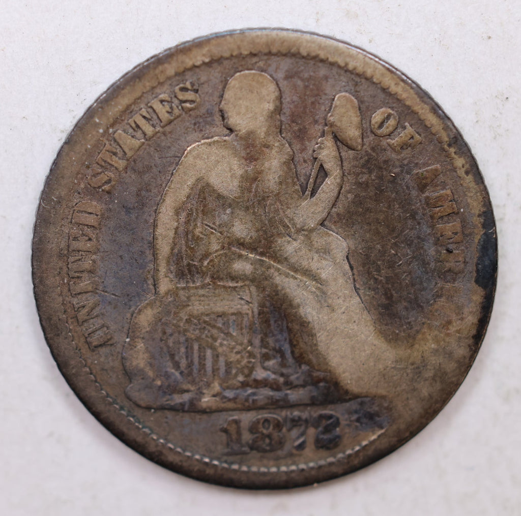 1872-CC Seated Liberty Dime, Collectible Circulated Coin, Store Sale #DE740.