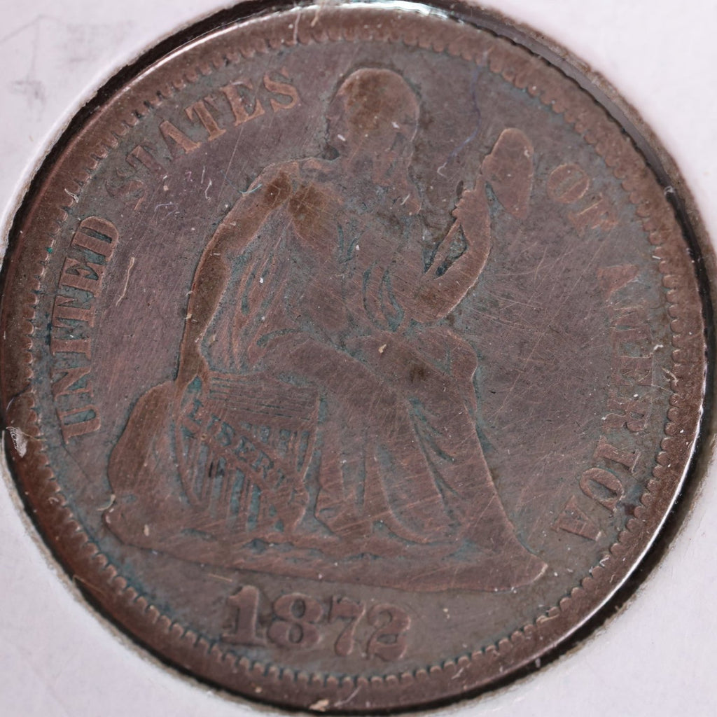 1872 Seated Liberty Silver Dime, Very Fine Circulated Coin, Store #d872.03