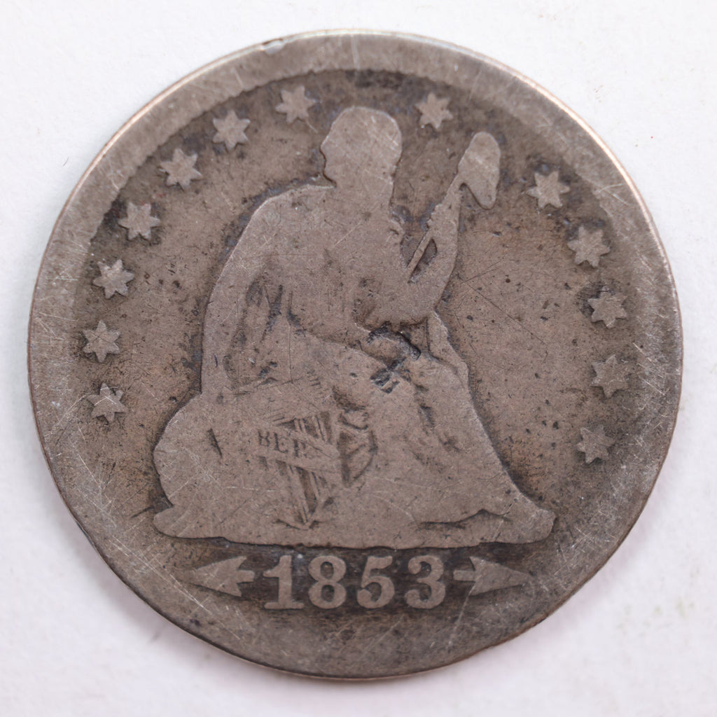 1853 Seated Liberty Quarter, Very Good Circulated Coin, Store #QR729