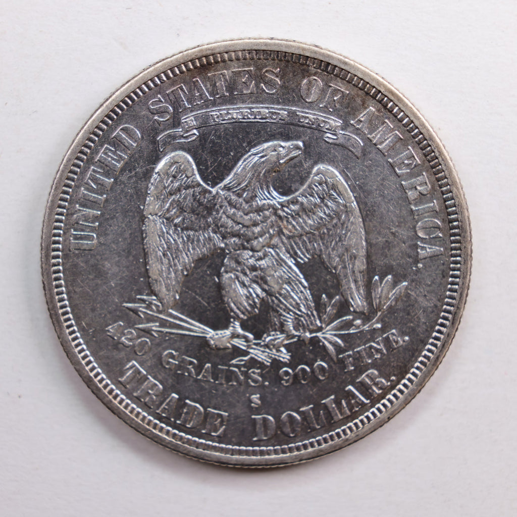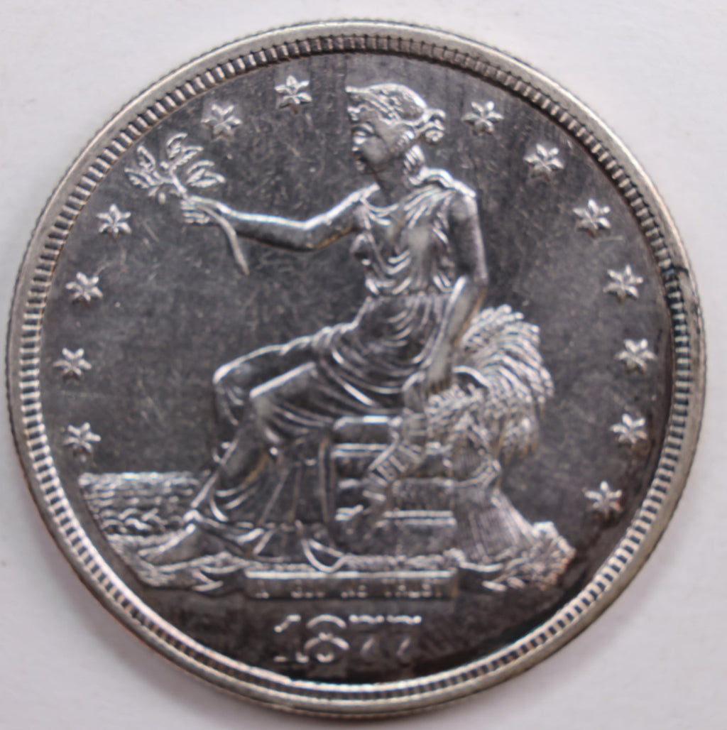 1877-S Trade Silver Dollar. About Uncirculated Detailed Coin., Store #DR0681