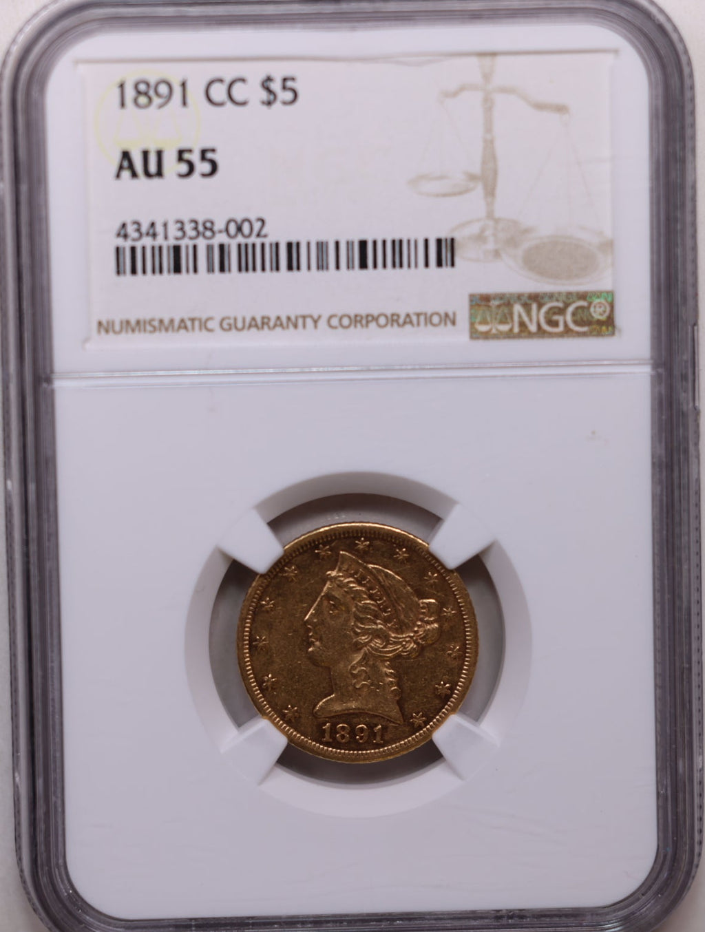 1891-CC $5, Gold Half Eagle, "Carson City", Circulated, NGC AU-55, Store Sale #G0155.