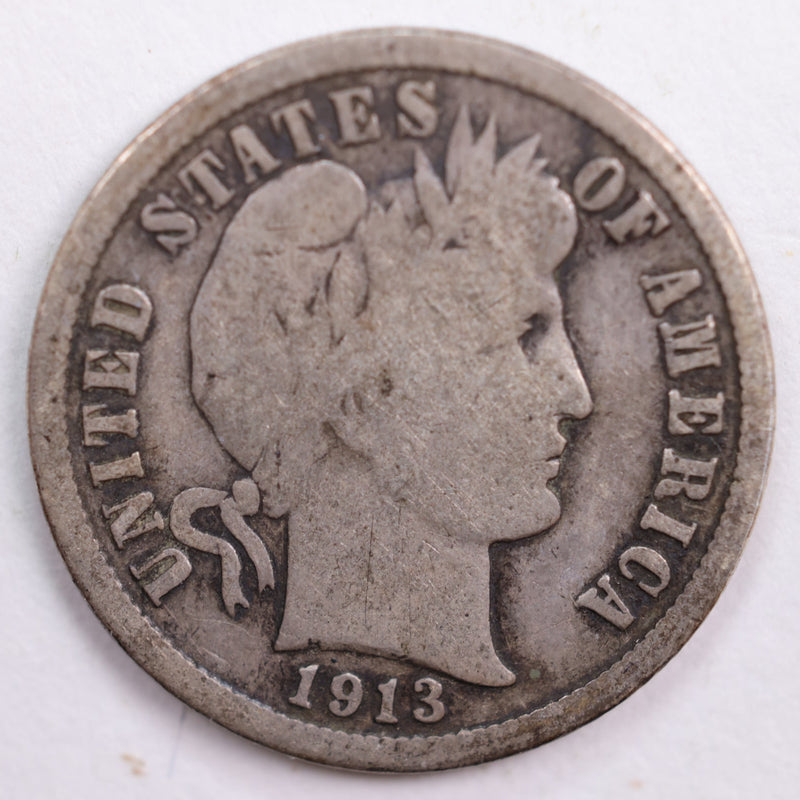 1913 Barber Silver Dime, Very Good Circulated Coin, Store #DE0524