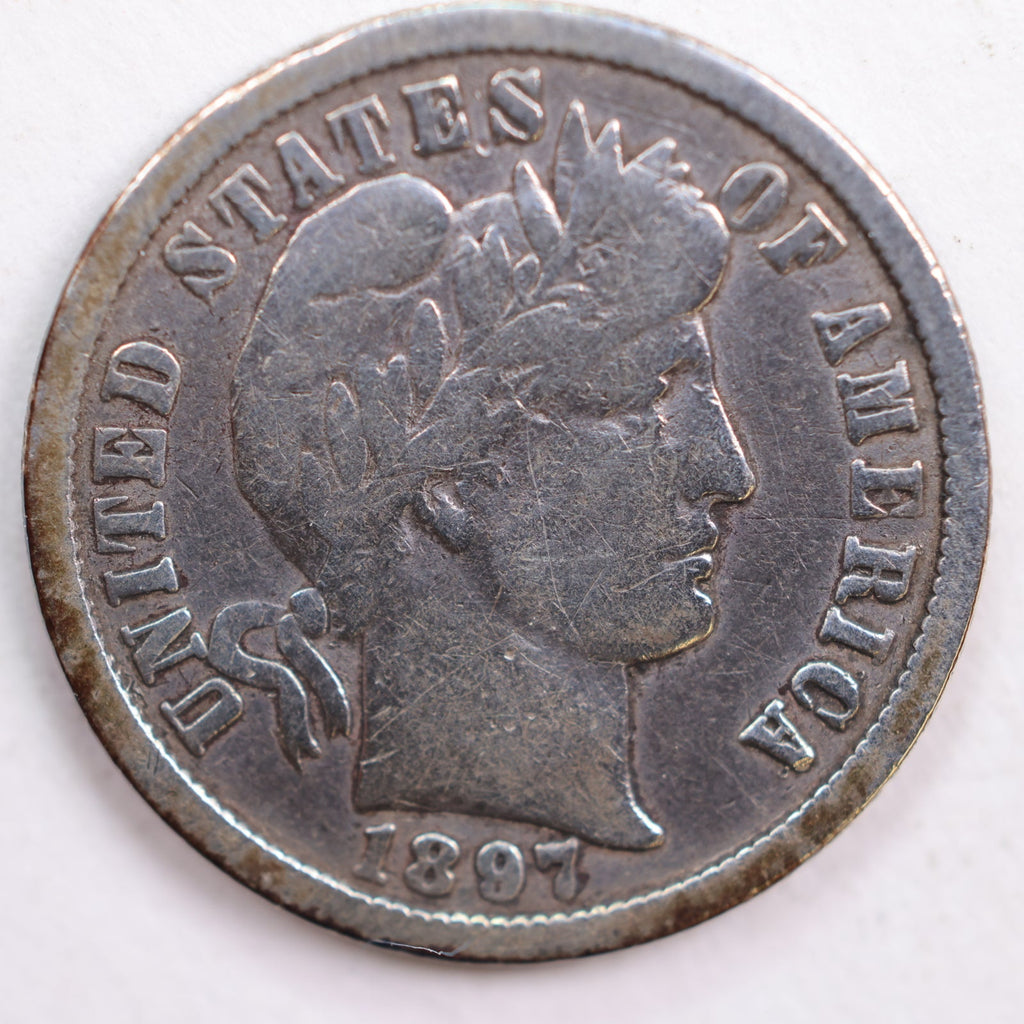 1897-O Barber Silver Dime, Very Good+ Circulated Coin, Store #DE0506