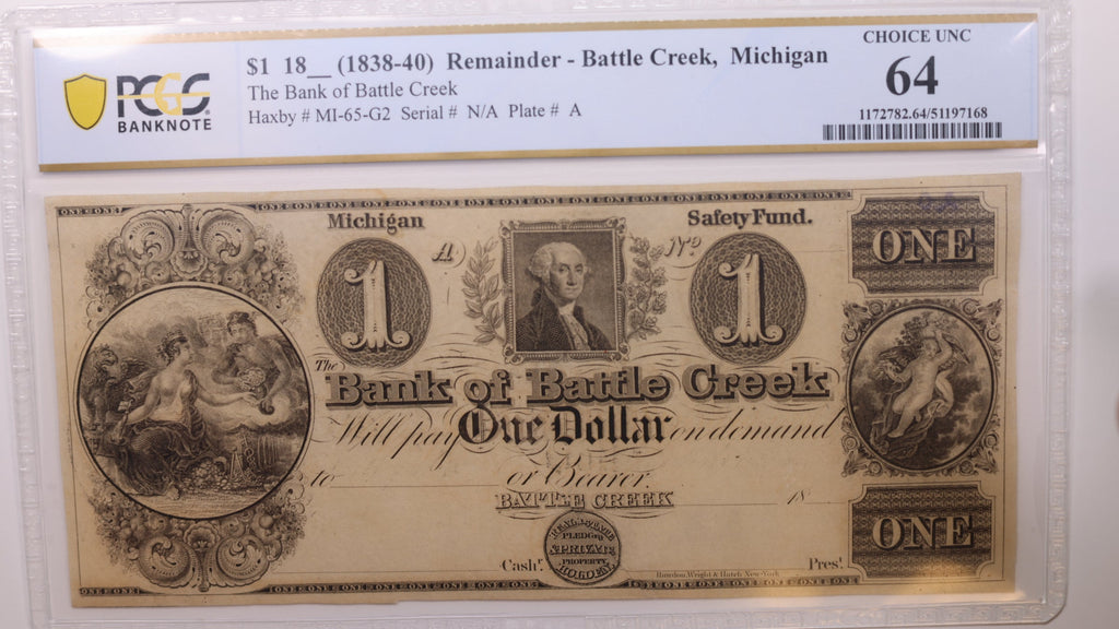 18__ $1, Battle Creek, MI., Obsolete Currency., PCGS CU-64., Store #GMI088.