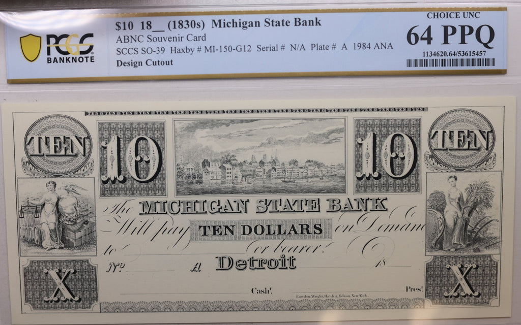 18__ $10 Michigan State Bank, ABNC Souvenir Card. PCGS CU-64, PPQ, Store #GMI0107.