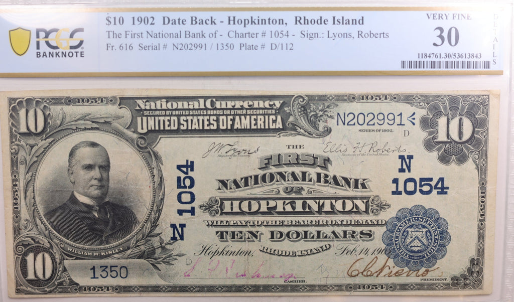 1902 $10, National Currency, Hopkinton, R.I., Ch #1054, PCGS VF-30. Store #NBN012.