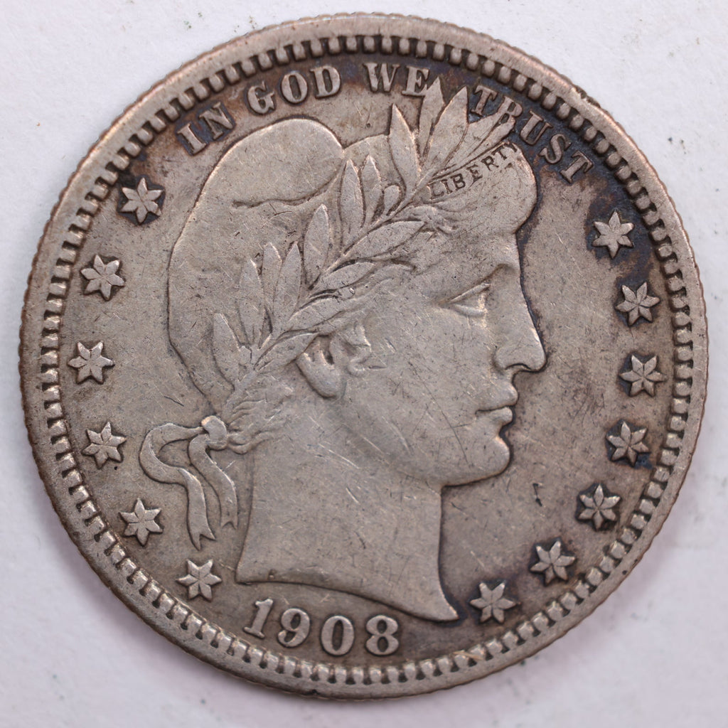 1908 Barber Silver Quarter, Very Fine Circulated Coin, Store #QR0496