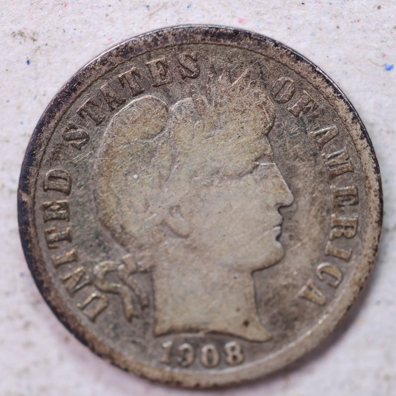 1908 Barber Silver Dime., Very Good., Circulated Coin., Store #1307