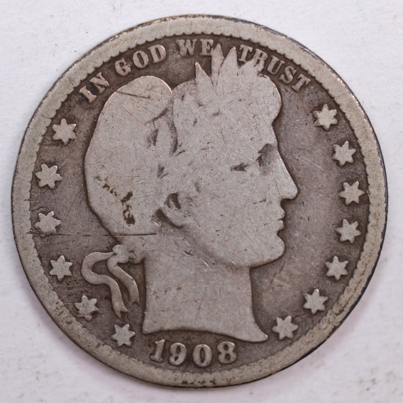 1908-S Barber Silver Quarter, Good Circulated Coin, Store #QR0509