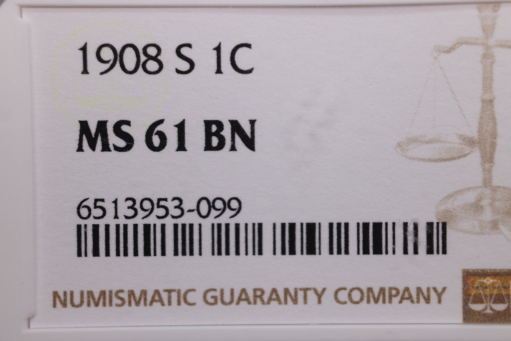 1908-S Indian Head Small Cents., NGC Graded MS-61, Brown., Store #GCT011
