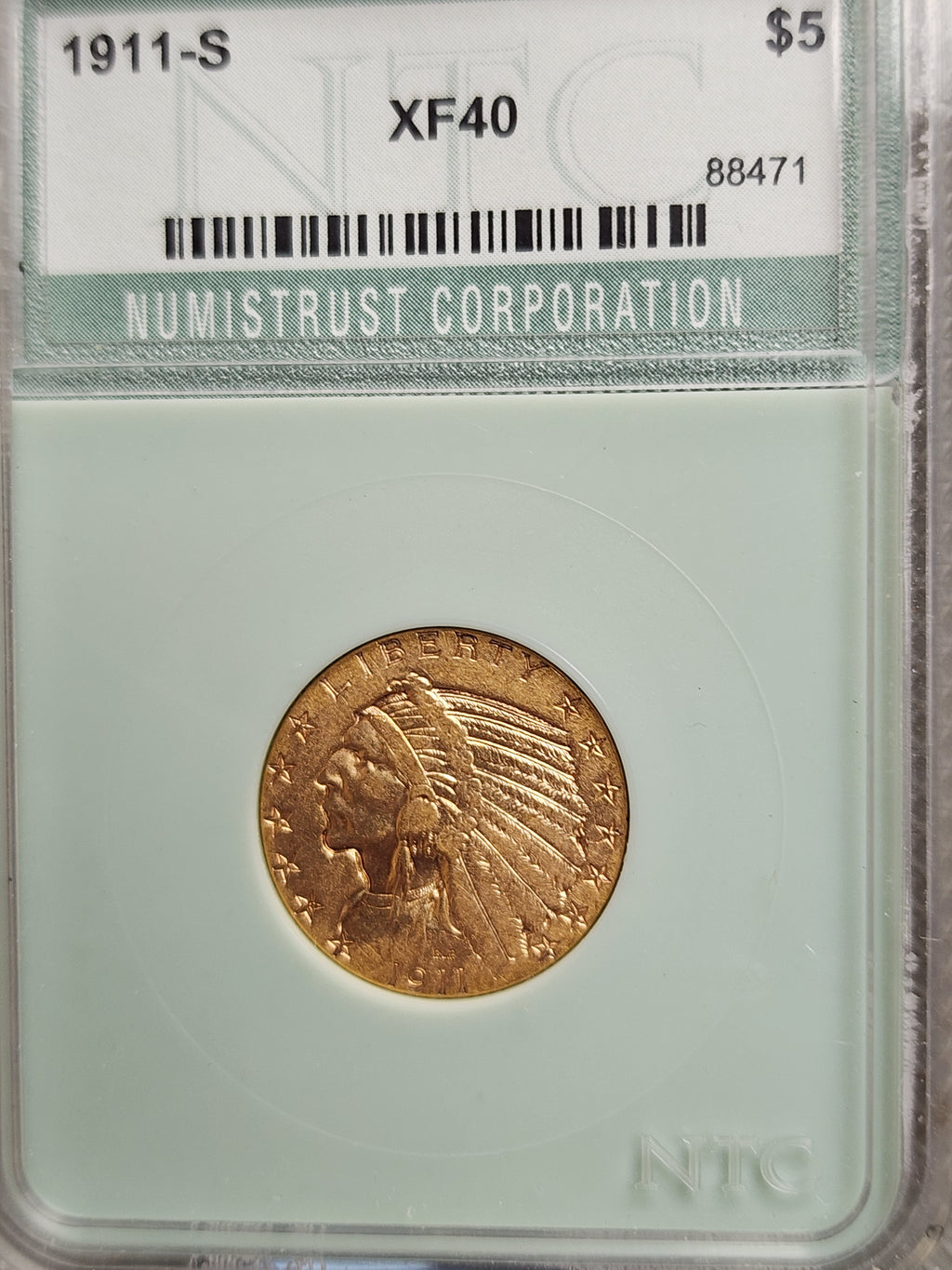 1911-S $5 Gold Indian, Quarter Eagle, Nice Extra Fine Circulated Coin, Store Sale #G0170.