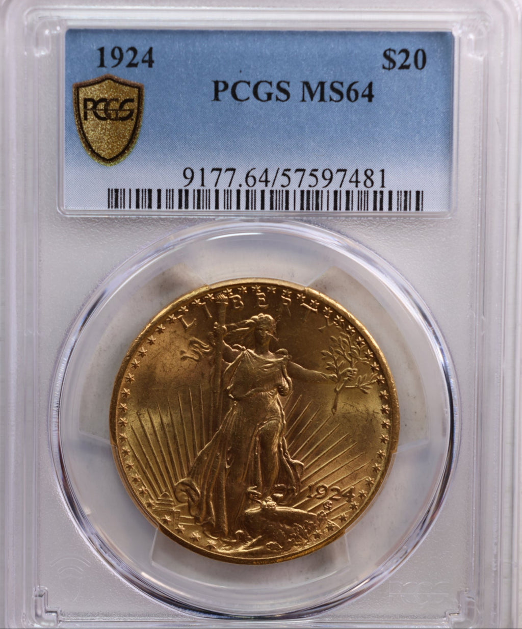 1924 $20 Saint GAUDENS Gold Coin, PCGS or NGC MS-64, Store Sale #G0067.