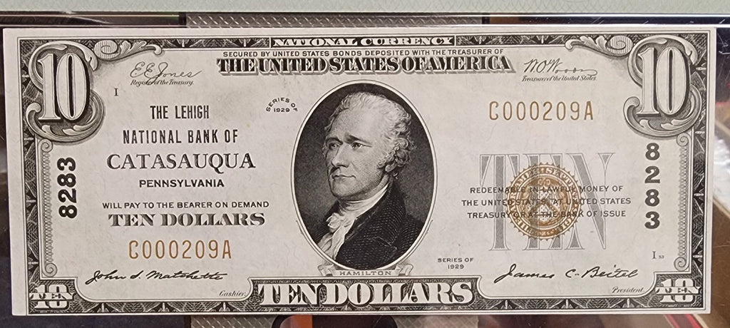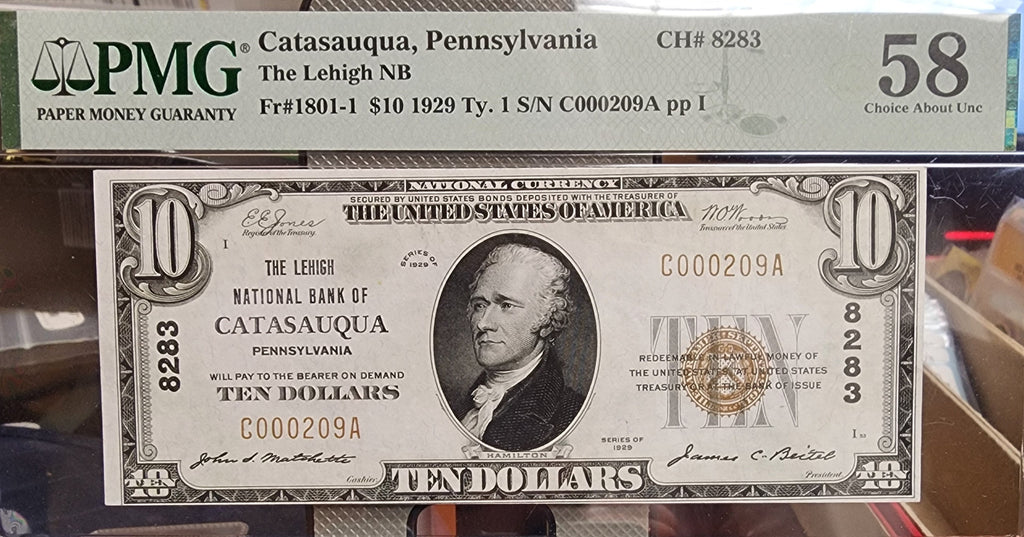 1929 $10 National, Catasauqua, PA, CH#8283, PMG AU-58, Store #NBN021.