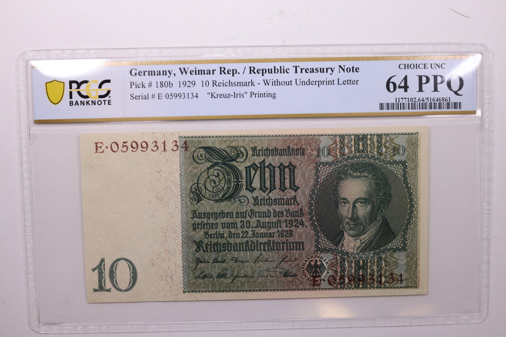 1929 10 Reichsmark, Pick# 180b., PCGS CU-64 PPQ., Store #GWC009