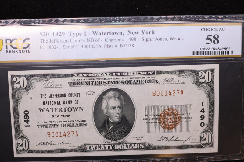 1929 $20, Watertown, N.Y., National Currency Note., PCGS Graded AU-58. Store #SGNB009