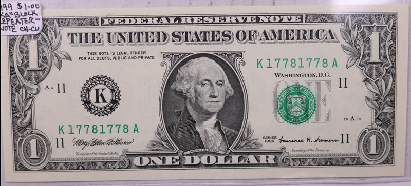 1999., $1., F.R.N., Repeater Serial Nr., Crisp Uncirculated., Store #0725