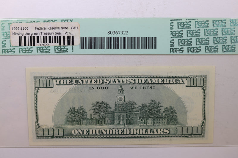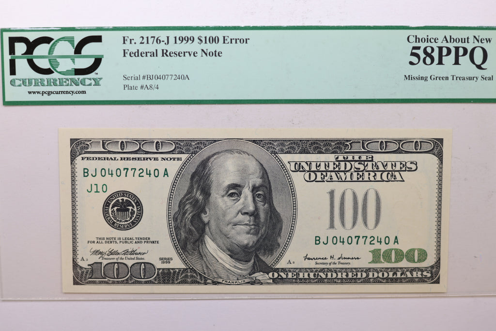 1999 $100, Federal Reserve Note, Error-Missing Green Seal, PCGS AU-58, PPQ, Store#GFRB089