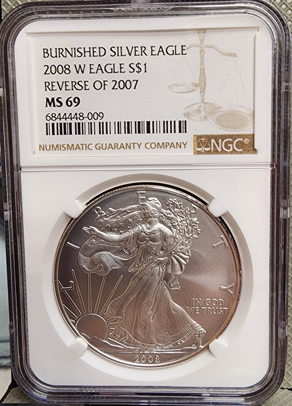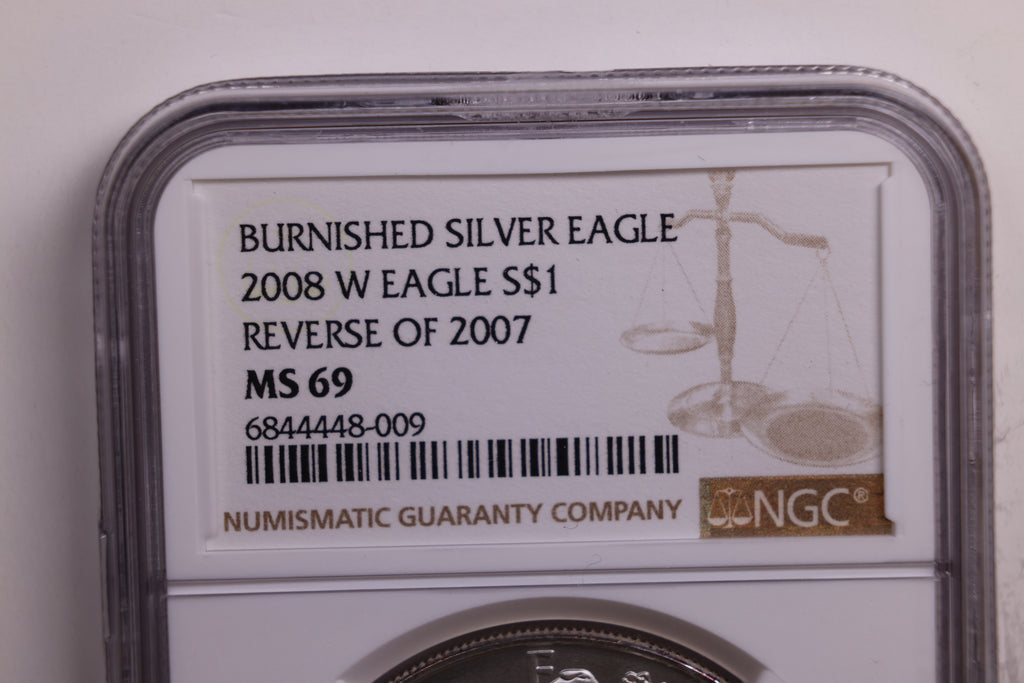 2008-W American Silver Eagle., Burnished, Rev 2007., NGC MS69., Store GSE042.