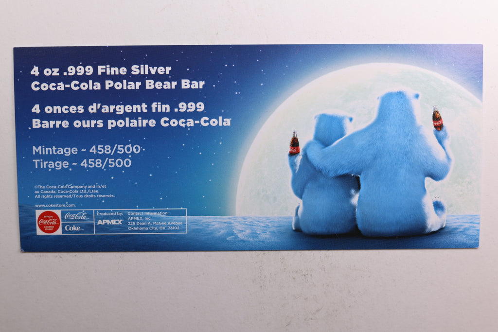 4 Troy Ounce Silver Bar, Coca Cola Polar Bear, Colorized in display case, Store #SR007