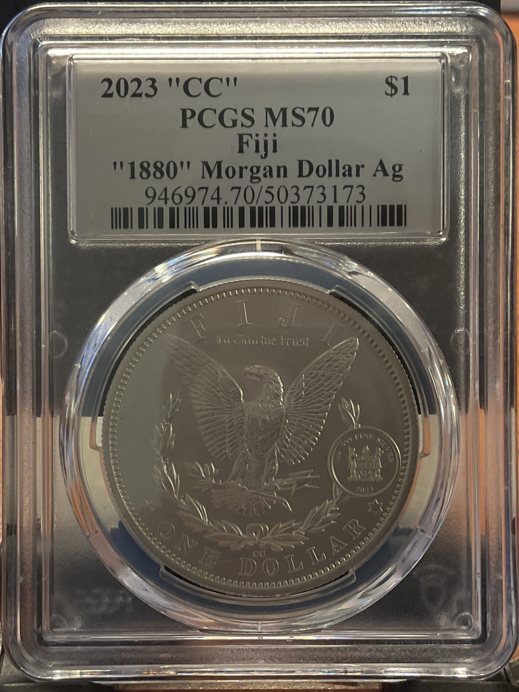 .999 silver, 1 Troy Ounce, 2023 Fiji Privy Morgan Ag, PCGS MS-70, Store #SR051