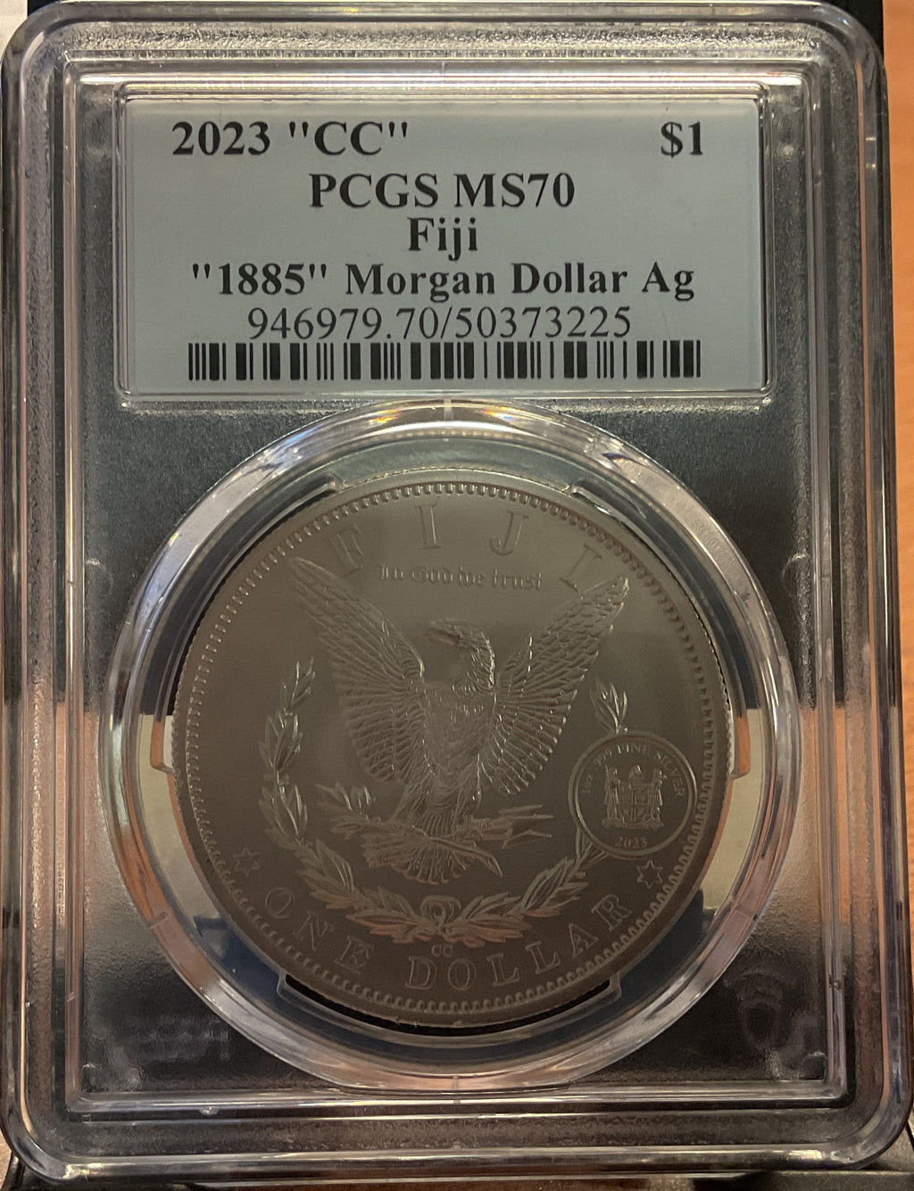 .999 silver, 1 Troy Ounce, 2023 Fiji Privy Morgan Ag, PCGS MS-70, Store #SR056