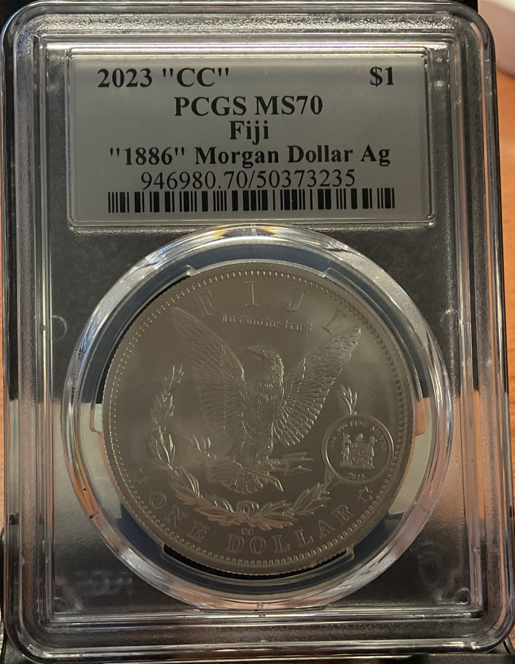 .999 silver, 1 Troy Ounce, 2023 Fiji Privy Morgan Ag, PCGS MS-70, Store #SR057