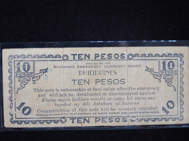 1943 Philippines Ten Pesos WWII Mindanao Emergency Currency Banknote, Store #12436